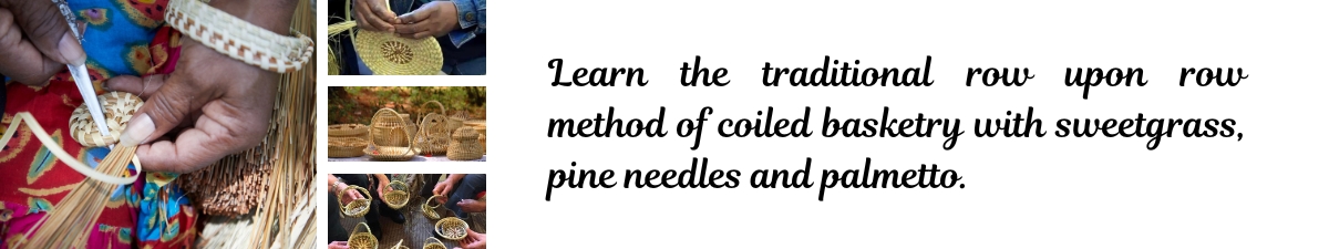 • Learn the traditional row upon row method of coiled basketry with sweetgrass, pine needles and palmetto, and learn how to use the “bone” to divide the sweetgrass and build the next row. All materials are included and each student completes a small basket and takes home a cherished memory.